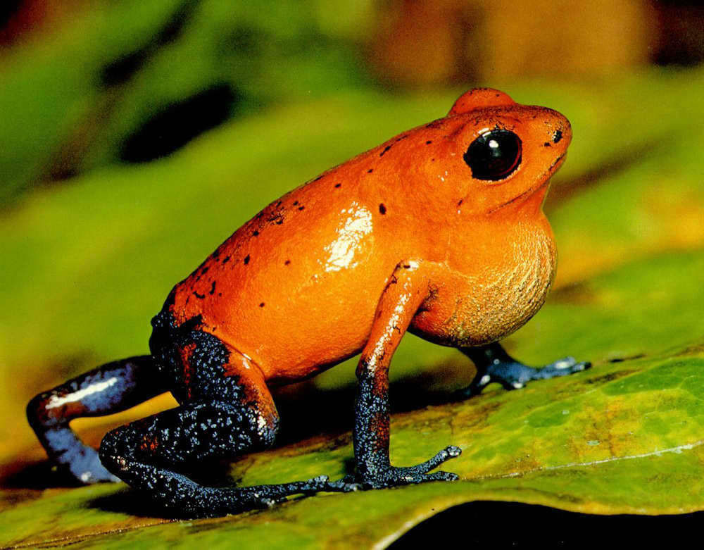 You have probably seen pictures of vividly colored frogs before. Wouldn't this be conspicuous to any predator, especially on a background of green? Yes! So why aren't all brightly colored frogs eaten up? It is not such an easy meal as you think. The bright reds and yellows are meant as a warning to tell predators that the frog is loaded with poisons. A dart frog would be a nasty surprise for a hungry predator. In fact, the name 'dart frog' comes from the fact that people tipped their arrows with frog poisons. Since this coloration is used for defense, both males and females possess it. You will never see these frogs in the wild unless you live in tropical South America or Africa